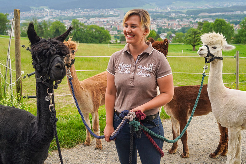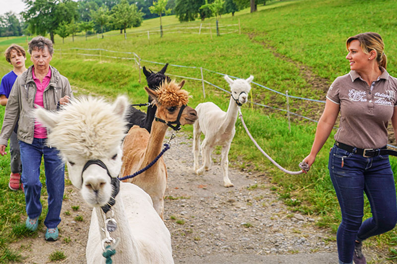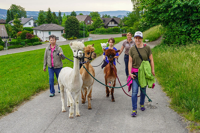 Apropos Spaziergang: Suchen Sie noch die passende Begleitung? Regelmässig werden Alpaka-Spaziergänge im Gebiet rund ums Eichholz, auf Wunsch aber auch im Natur- und Naherholungsgebiet Egelsee angeboten. Wie heisst es so schön: «Mit der richtigen Begleitung wird jeder Spaziergang zum Erlebnis.» Und das trifft tatsächlich zu: Gemütlich und im Schritttempo der Alpakas geht es los, und bald merkt jeder, dass die Alpakas einfach ganz lieb sind, vor allem auch, wenn sie ihren eigenen Kopf ein bisschen durchsetzen können. Ein tolles Erlebnis für Familien, Junggebliebene, Gotte und Göttis und alle anderen.