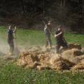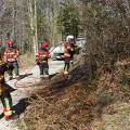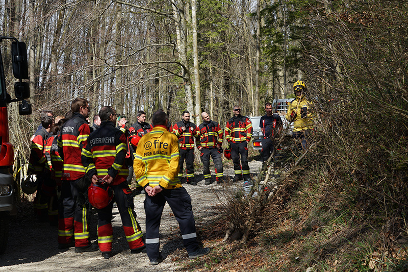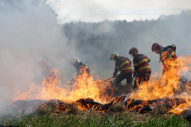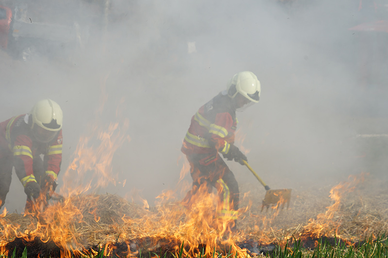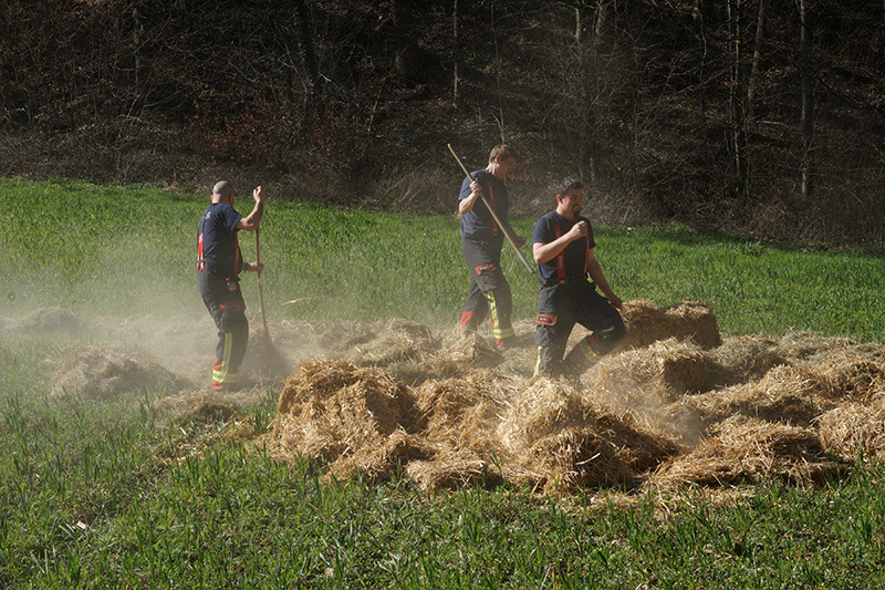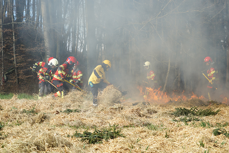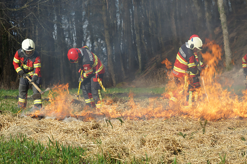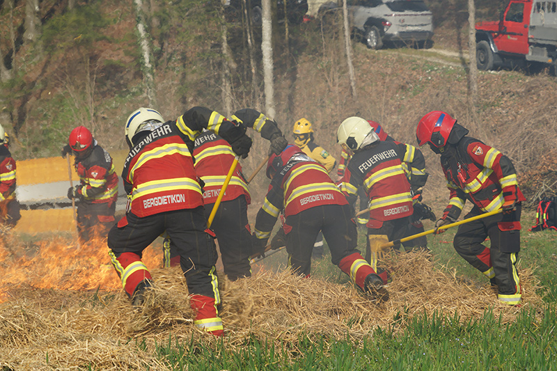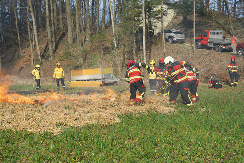 Am Nachmittag ging es dann in die Praxis. Im nahegelegenen Wald setzten die Feuerwehrleute das erlernte Wissen in die Tat um. Mit Rechen und anderen Werkzeugen arbeiteten sie an der Schaffung von Schutzzonen, um die Ausbreitung von Bränden zu verhindern. Ein besonderes Augenmerk lag dabei auf einem Feld mit Stroh und Heu, das kontrolliert angezündet wurde, um die Techniken zur Brandbekämpfung unter realistischen Bedingungen zu erproben. Durch das Anlegen von Schneisen konnten die Feuerwehrfrauen und -männer demonstrieren, wie man die Ausbreitung eines Feuers effektiv eindämmt.