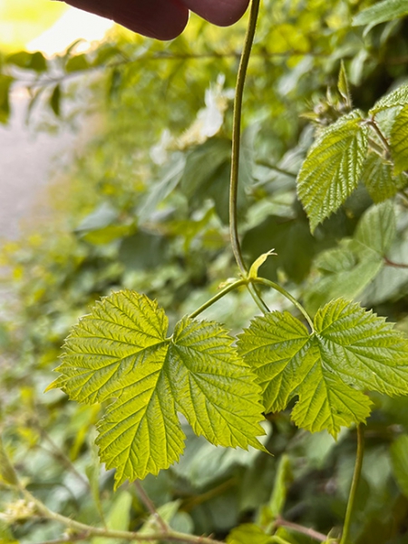 Hier horchten vor allem die Bierfreunde auf («jetzt wird’s interessant!»). Der schnellwachsende Hopfen ist eine Schlingpflanze, die sich von oben betrachtet im Uhrzeigersinn um ihre Kletterhilfe windet. Hopfen gehört zu den zweihäusigen Pflanzen, das heisst, eine einzelne Hopfenpflanze hat entweder nur männliche oder nur weibliche Blüten. Anders verhält es sich bei einhäusigen Pflanzen, bei denen eine Pflanze sowohl männliche als auch weibliche Blüten hat – eben alle in nur einem Haus.Bittersüsser Nachtschatten